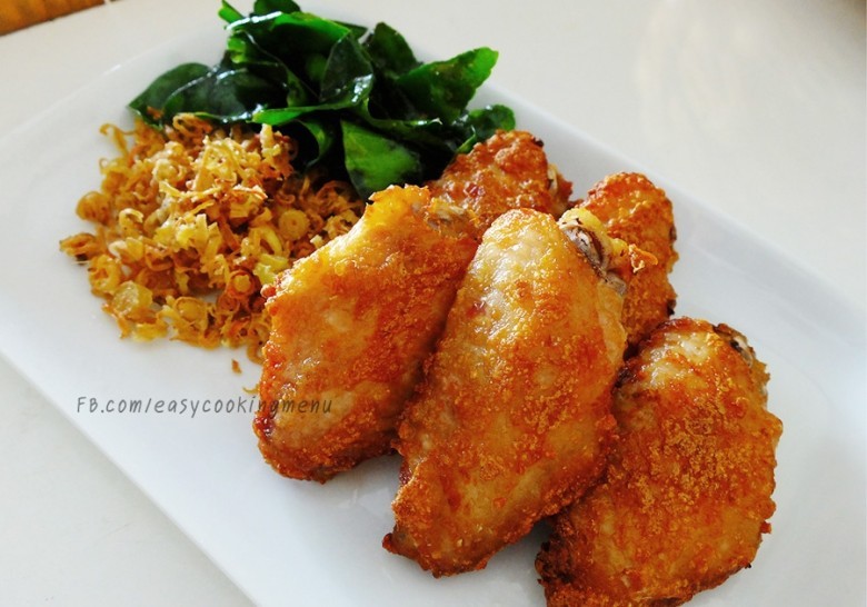 1. นำปีกไก่ แป้งสาลี เกลือ น้ำมันหอย น้ำเปล่า และตะไคร้สับละเอียด คลุกเคล้าให้เข้ากัน พักทิ้งไว้ประมาณ 10-15 นาที