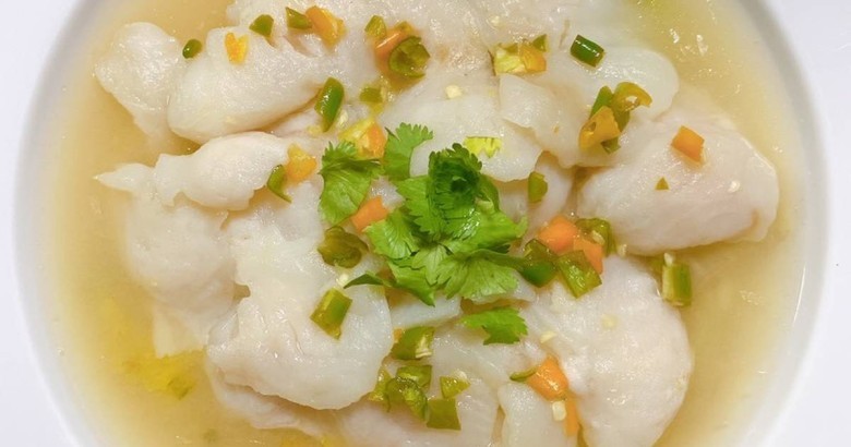 3. วางปลานึ่งลงในจาน ราดน้ำยำลงไป แต่งด้วยมะนาวฝาน และผักชีให้สวยงาม พร้อมเสิร์ฟ
