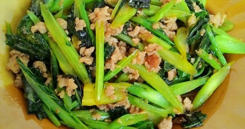 3.ใส่คะน้าและพริกลงไปผัดจนสุก