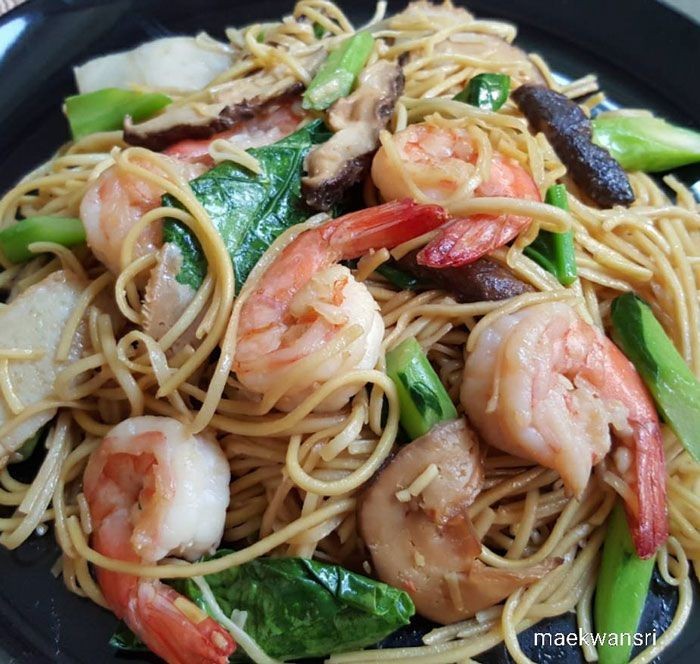 4.ใส่เห็ดหอมและกุ้งลงไปผัดให้เข้ากัน เมื่อกุ้งใกล้จะสุกใส่คะน้าลงไปผัดปรุงรสตามชอบ