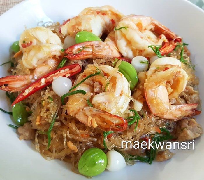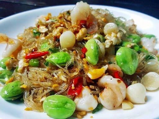 4.ใส่วุ้นเส้นลงไป สะตอ และซอสปรุงรสข้อ2 ผัดให้เข้ากัน