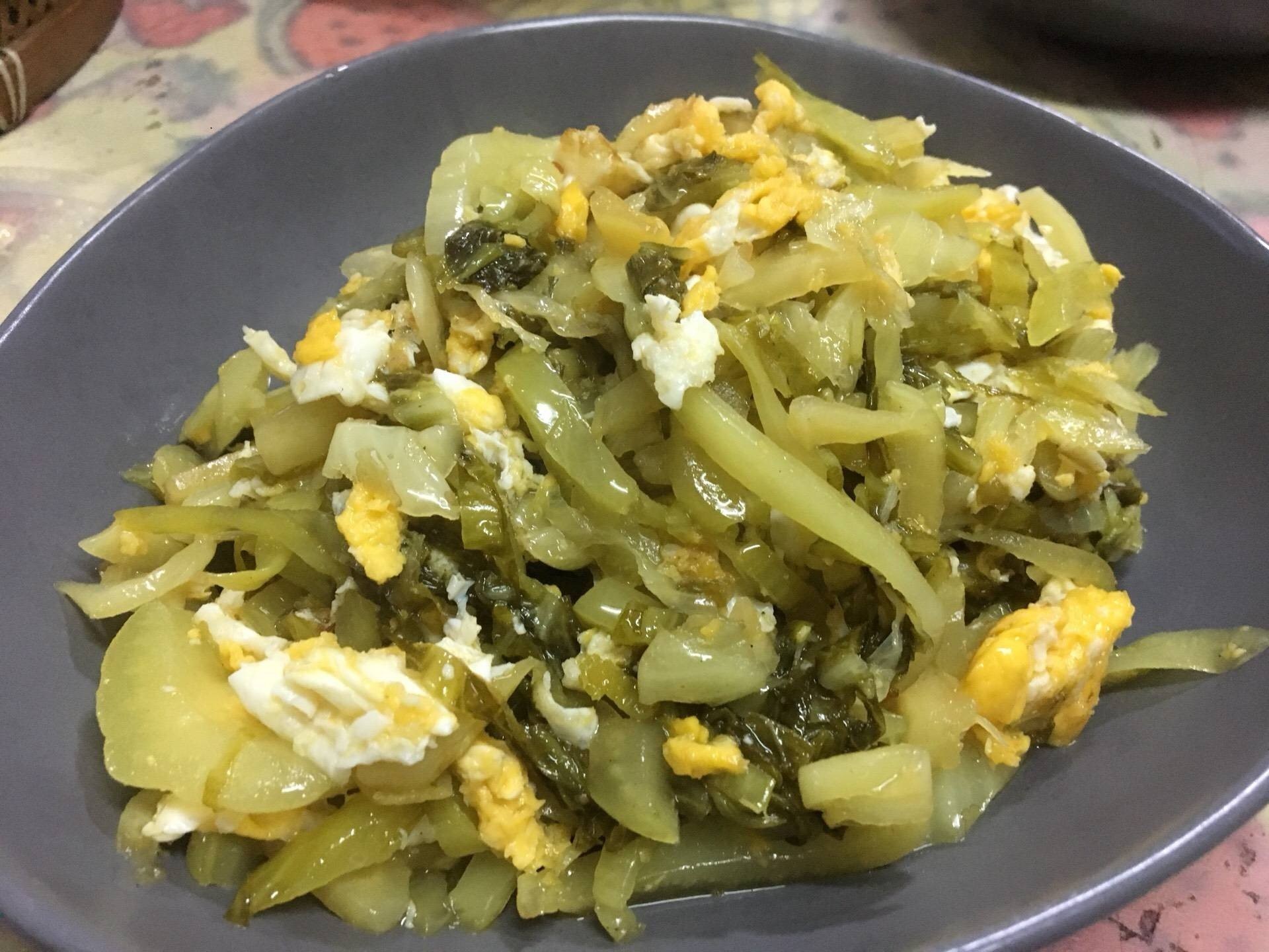 วิธีทำ ผักกาดดองผัดไข่1.นำผักกาดดองมาหั่นฝอย นำกระทะใส่น้ำมัน แล้วตั้งไฟปานกลาง พอน้ำมันเริ่มร้อนใส่กระเทียมบุบลงเจียวพอหอม 2.ใส่ผักกาดดองหั่นฝอยลงผัด พอเริ่มสุก ปรุงรสด้วยน้ำตาลและผงชูรสเล็กน้อย