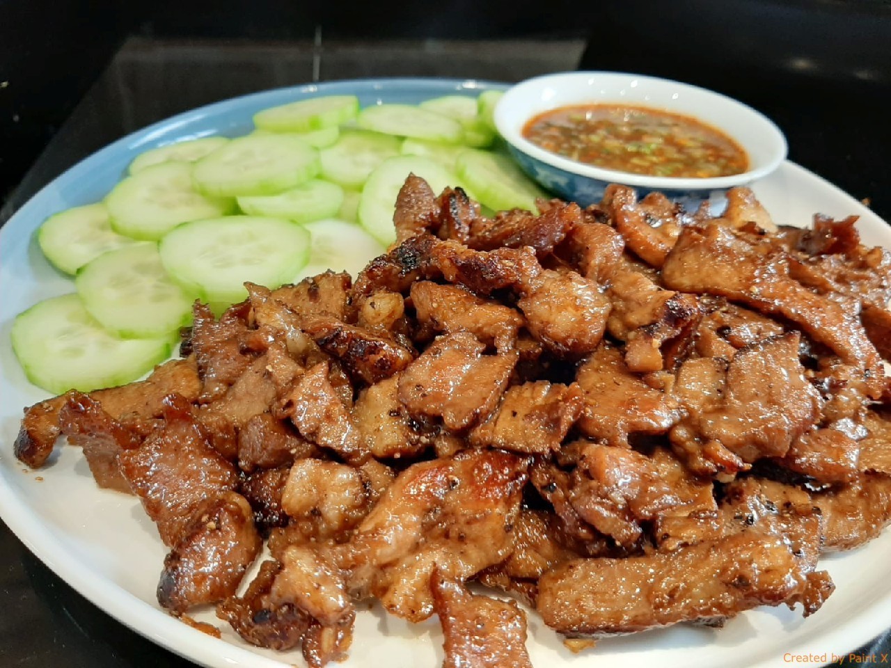 - นำหมูเนื้อแดงมาหั่นเป็นชิ้นบางๆ พอดีคำ