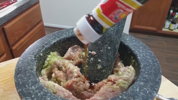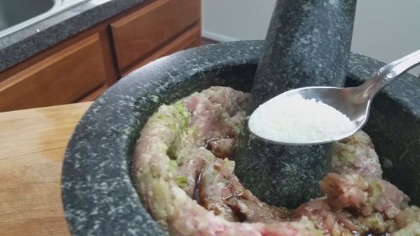 • นำกระเทียม พริกไทย และรากผักชีมาตำให้ละเอียด แล้วนำหมูสับมาคลุกกับสามเกลอเลยค่ะ วันนี้ขอใส่ในครก ใช้สากตำนิดหน่อย ทำให้เนื้อหมูสับเหนียวยิ่งขึ้นด้วยค่ะ (เคล็ดลับหรือเปล่าไม่รู้นะคะ)