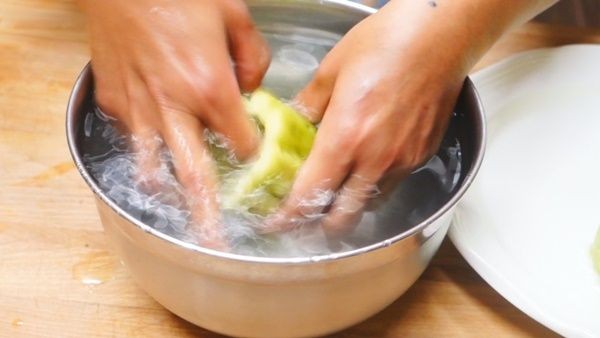 • จากนั้นเราจะแช่น้ำเกลือก็ได้นะคะ แช่ในน้ำเกลือสัก 10-15 นาที ก่อนนำไปต้ม แต่