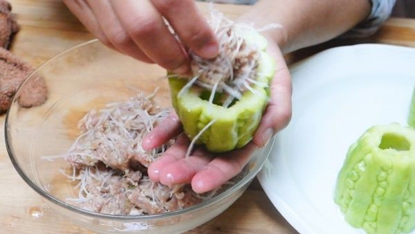 • จับหมูที่เราปรุงไว้แล้วมายัดใส่ในมะระเลยค่ะ ยัดให้แน่นเลยค่ะ