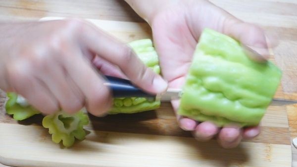 • เรามาจัดการกับมะระกันก่อน นำมะระมาผ่าเป็นท่อน ยาวประมาณ 2-3 นิ้ว ควักไส้ออกกับขูดตรงขาว ๆ ออกด้วยค่ะ เพราะทำให้มะระขมเช่นกัน