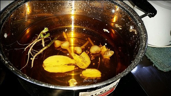 ใส่นำลงในหม้อ ตามด้วยซีอิ๊วขาว กระเทียมดอง พริกไทยเม็ด รากผักชี และขิงแก่ทุบ นำขึ้นตั้งไฟต้มจนเดือด