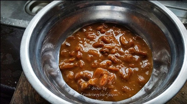 ใส่เต้าเจี้ยวลงในอ่างผสมทั้งน้ำและเนื้อ (ไม่ต้องบด)