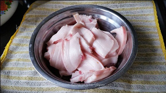 ซอยมันหมูเป็นแผ่นบาง ๆ