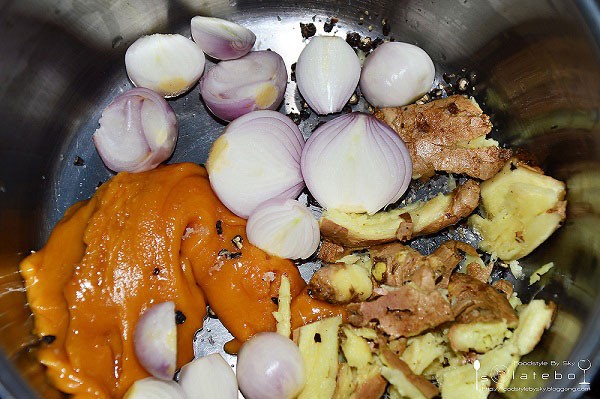 ทุบขิงพอหยาบ พริกไทยบุบพอแตก หอมแดงผ่าซีกหรือใส่ทั้งหัวก็ได้ หากมีตะไคร้ก็ทุบ ๆ แล้วหั่นยาวหน่อย รองไว้ก้นหม้อ ถ้าไม่มีเลยไม่ใส่ก็ได้