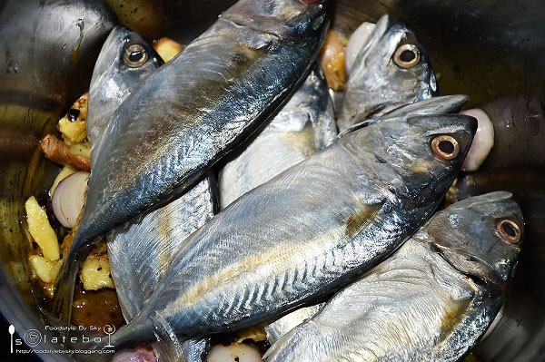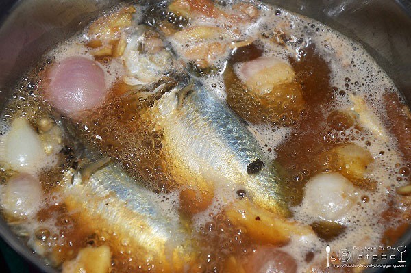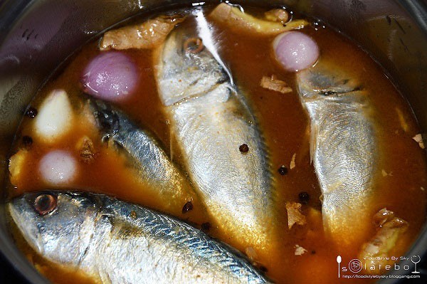 นำปลาทูที่ควักไส้และล้างสะอาดแล้วใส่ลงไป (เรียงไม่สวย ปลาแช่แข็งตัวเล็กไปหน่อยรอบนี้ แถมไม่สด ทำให้ต้มแล้วท้องปลาเละ)