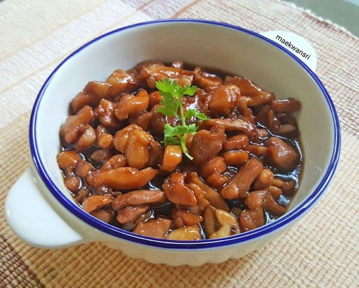 1. ตั้งกระทะเปิดไฟ ใส่น้ำมันพอเริ่มร้อน ใส่กระเทียมสับลงไปผัดจนหอม ใส่ไก่ลงไปผัด ปรุงรสด้วยน้ำตาลปีบ ซีอิ๊วขาว ซีอิ๊วดำ เติมน้ำเคี่ยวด้วย ไฟอ่อน จนรสชาติ เข้าเนื้อ
