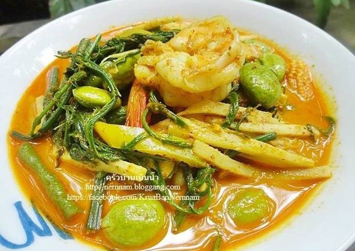 - ใส่หัวกระทิในกระทะผัดพอแตกมันใส่น้ำพริกแกงผัดให้หอม ใส่หน่อไม้ ชะอม ยอดฟักทอง ผักบุ้ง สะตอ ข้าวโพด ถั่วฝักยาว มะเขือยาว พริกหยวก ใส่กุ้ง คนให้ทั่ว
