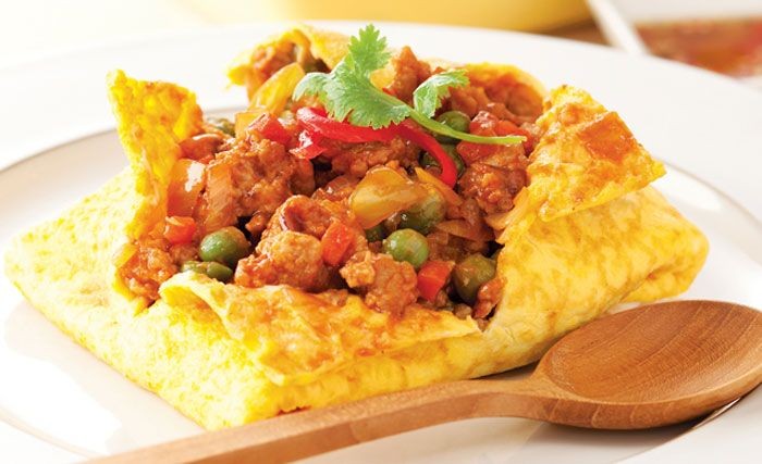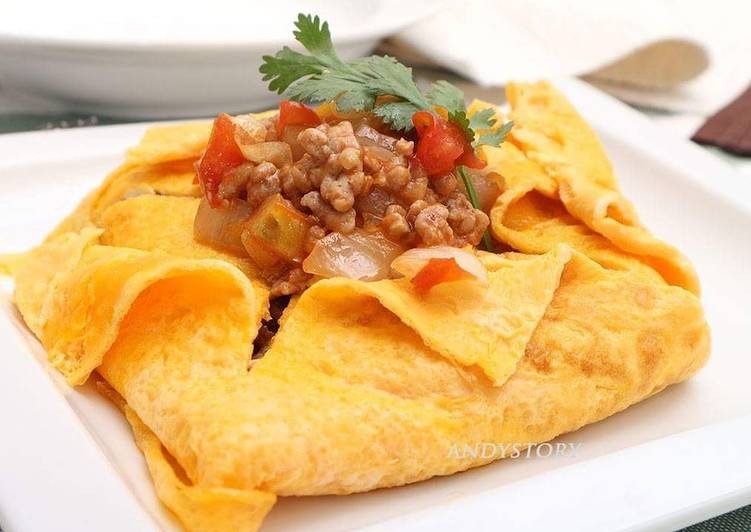 - ตีไข่ไห้เข้ากัน ใส่น้ำมันลงในกระทะเล็กน้อยพอน้ำมันร้อน หมุนกระทะใหัน้ำมันถูกกระทะทั่วๆ พอร้อนดี เทน้ำมันออกจากกระทะ เทไข่ใส่ กลอกไข่ให้เป็นแผ่นบาง ตักไส้ที่ผัดไว้ใส่ตรงกลาง พับเป็นรูปสี่เหลี่ยม ตักใส่จานเสิร์ฟ