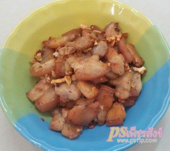 4.เมื่อหมูเริ่มมีสีเหลืองทอง ให้ใส่กระเทียมที่หั่นไว้ลงเจียวในน้ำมัน เจียวจนหอมเหลืองก็เป็นอันใช้ได้ เสร็จแล้วก็ปิดไฟ ตักใส่จานเสิร์ฟได้เลย