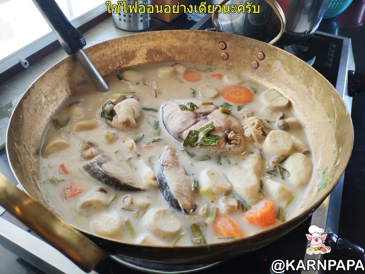1ต้มหัวและหางกะทิใส่ข่า,ตะไคร้,หอมแดง,ใบมะกรูด ลงไปต้มพอมีกลิ่นหอม