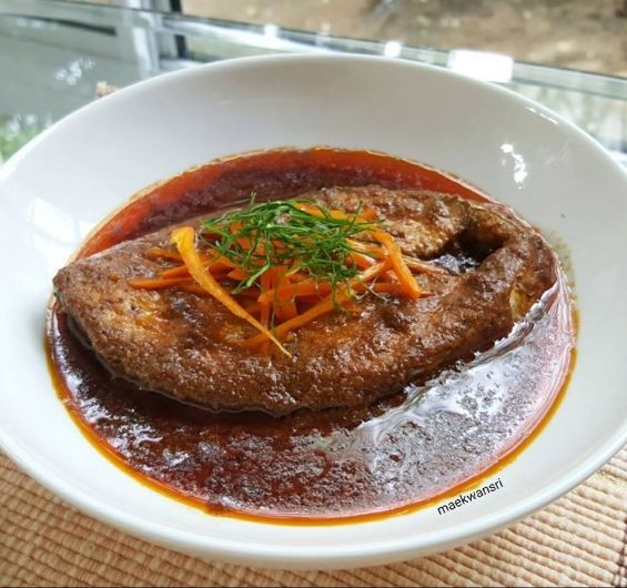 4.ตักปลาและน้ำแกงใส่จาน โรยหน้าด้วย ใบมะกรูดและพริกซอย แค่ก็เลิศแล้วค่ะ