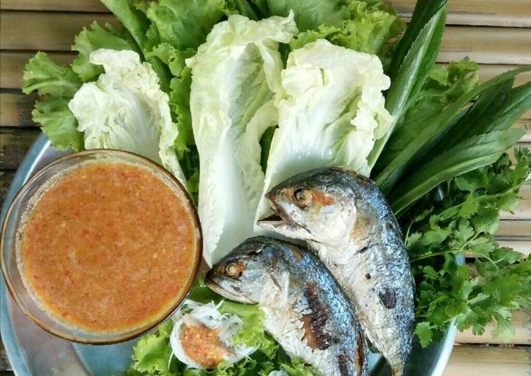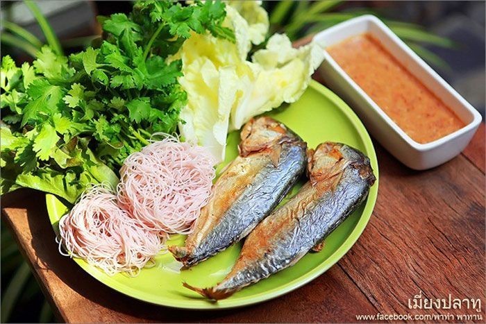 4. นำปลาทูจัดลงใส่จาน นำผักตามชอบวางลงไป ตามด้วยเส้นหมี่ เสิร์ฟพร้อมน้ำจิ้ม