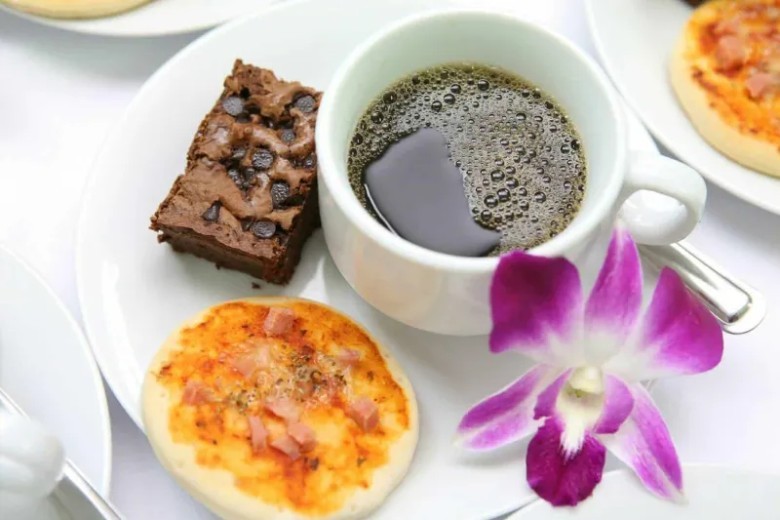 4.ชุดแซนวิชไส้ผักล้นกับน้ำเปล่า หรือกาแฟ แซนวิชเป็นอาหารว่างยอดนิยมที่หลายๆ คนมักเลือกนำมาจัดในอาหารเบรค ตัวอย่างไส้แซนวิชที่แนะนำ เช่น อกไก่นึ่ง ปลาทูน่า ไข่ต้ม หรือ ปลาแซลมอน เพิ่มเติมด้วยผักหลากหลาย และเลือกขนมปัง Whole wheat ประมาณ 1 แผ่น แต่หากบางร้านเป็นขนมปัง 2 แผ่น อาจเลือกเบรคมื้อนั้นเป็นเบรคสำหรับมื้อเช้า เผื่อผู้เข้าร่วมประชุมที่ยังไม่ได้ทานข้าวเช้าได้ทานอะไรตกถึงท้องบ้าง และเนื่องจากแซนวิชเป็นอาหารว่างที่ให้พลังงานประมาณ 200 kcal อยู่แล้ว จึงควรจัดคู่กับเครื่องดื่มที่ไม่มีน้ำตาลเช่นน้ำเปล่า ชา หรือ กาแฟดำ