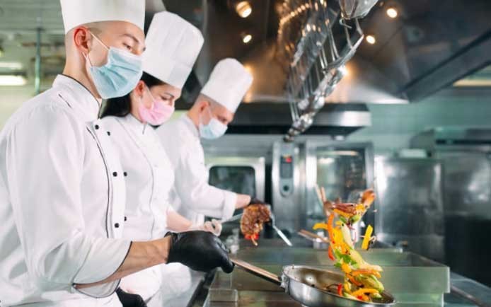 ในสถานประกอบการร้านอาหารต่างๆ ผู้ให้บริการใกล้ชิดแก่ลูกค้า รวมถึงพนักงานครัวที่จัดเตรียมวัตถุดิบและปรุงอาหาร ยังคงต้องสวมหน้ากากอนามัย เพื่อป้องกันและควบคุมการแพร่ระบาดของโควิด-19