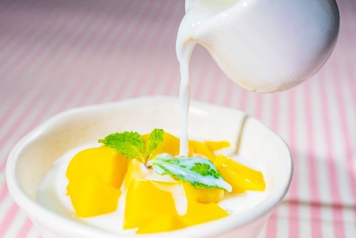 หมดปัญหาอยากกินแต่ไม่ได้กิน เพราะกลัวได้พลังงงานเยอะ เราจัดขนมหวานเย็นชื่นใจที่แคลอรีต่ำมาให้ได้ลองกันค่ะ ฤดูนี้ผลไม้รสหวานเย็นอย่างมะม่วงสุกหาได้ไม่ยาก ราคาก็หยิบจับได้ แต่จะกินกับข้าวเหนียวมูนก็คงจะหนีไม่พ้นขนมที่มีแป้งน้ำตาลไขมันสูงอีก มาดัดแปลงให้เป็น “เต้าฮวยมะม่วงนมสด” แบบ low calorie ทำง่าย วัตถุดิบน้อย แช่เย็นกินชื่นใจ ที่สำคัญพลังงานน้อยกว่ากินข้าวเหนียวมะม่วงหลายเท่าเลย