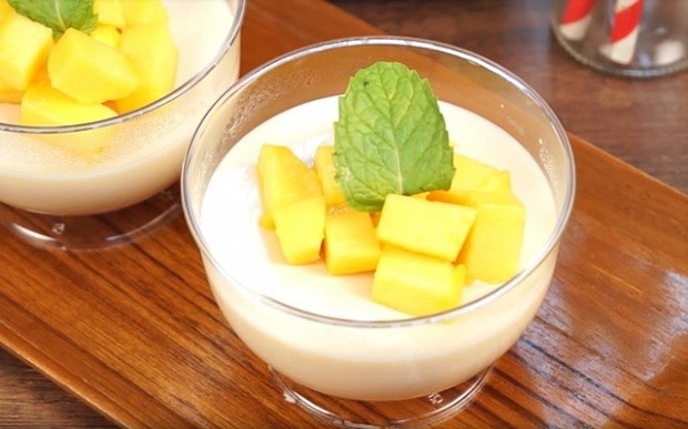 1. เตรียมหม้อใส่น้ำ และผงวุ้นคนให้ละลายพักไว้ ใส่มะม่วงปั่น และนมสด 300 มิลลิลิตรนำขึ้นตั้งไฟ คนให้พอเดือด ใส่เจลาตินคนให้ละลาย ยก ลงจากเตาคนต่อจนอุ่น