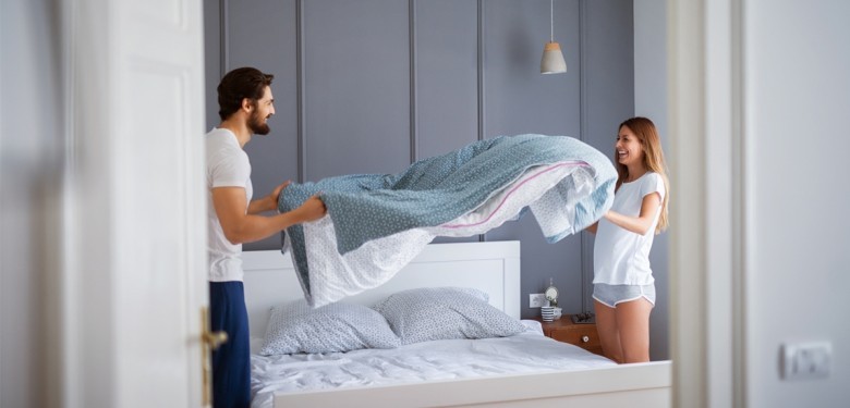 - สุดท้ายเลือกผ้าปูที่นอนโดยมีแบบ และสีสันที่เรียบง่าย อย่าเน้นลวดลาย