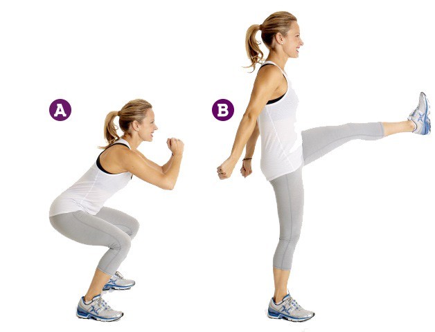 ยืนกางขาทั้งสองข้างกว้างประมาณหัวไหล่ สองมือกำหลวมๆ ระดับอก ค่อยๆ ย่อตัวลงโดยให้หลังตึงพร้อมกับยื่นสะโพกไปด้านหลัง งอเข่าจนขาขนานกับพื้น ยืดตัวขึ้นกลับสู่ท่ายืนพร้อมกับเตะขาซ้ายไปด้านหน้าให้สูงที่สุดเท่าที่จะทำได้ จากนั้นย่อตัวลงเหมือนเดิม แล้วเปลี่ยนเป็นเตะขาขวา ทำสลับขาไปมา 15 ครั้ง เป็น 1 เซต ทำทั้งหมด 3 เซต