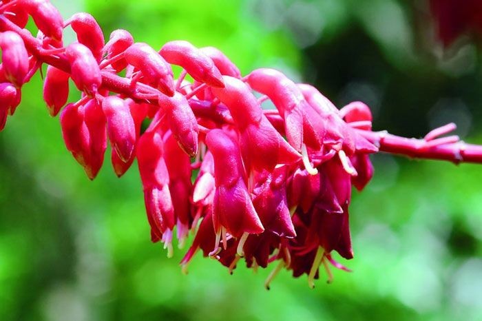 ดอกย่านางแดง ออกดอกเป็นช่อกระจะตามปลายกิ่ง มีรูปทรงเป็นรูปทรงกระบอกแคบ โค้งเล็กน้อย ปลายบานและห้อยลง มีความยาวประมาณ 15-100 เซนติเมตร ช่อดอกมีดอกย่อยจำนวนมาก กลีบดอกเป็นสีแดงสดมี 5 กลีบ ลักษณะเป็นรูปไข่กลับ ยาวประมาณ 1.2-1.5 เซนติเมตร มีขนสีขาวขึ้นปกคลุม ปลายกลีบดอกมีลักษณะมนแหลม ฐานรองดอกมีลักษณะเป็นรูประฆัง ดอกมีเกสรเพศผู้จำนวน 3 ก้าน บ้างว่า 5 ก้าน ก้านเกสรเป็นสีแดงยื่นพ้นกลีบดอก ส่วนเกสรเพศผู้ที่เป็นหมันอีก 7 ก้านมีความยาวไม่เท่ากัน ส่วนรังไข่มีความยาวประมาณ 0.7 เซนติเมตร มีขนสั้นขึ้นปกคลุม ก้านสั้น ส่วนก้านเกสรเพศเมียมีความยาวประมาณ 0.7 เซนติเมตร ยอดเกสรเพศเมียไม่ชัดเจน มีใบประดับเป็นรูปลิ่ม ติดทน มีความยาวประมาณ 1 เซนติเมตร และกลีบเลี้ยงเป็นสีแดง 5 กลีบ ปลายแยกเป็นแฉก 5 แฉก มีลักษณะของกลีบเลี้ยงเป็นรูปถ้วย ยาวประมาณ 0.5-1 เซนติเมตร มีขนสั้นขึ้นปกคลุม สีชมพูอ่อนหรือสีแดง โดยจะออกดอกในช่วงเดือนพฤษภาคมถึงเดือนสิงหาคม