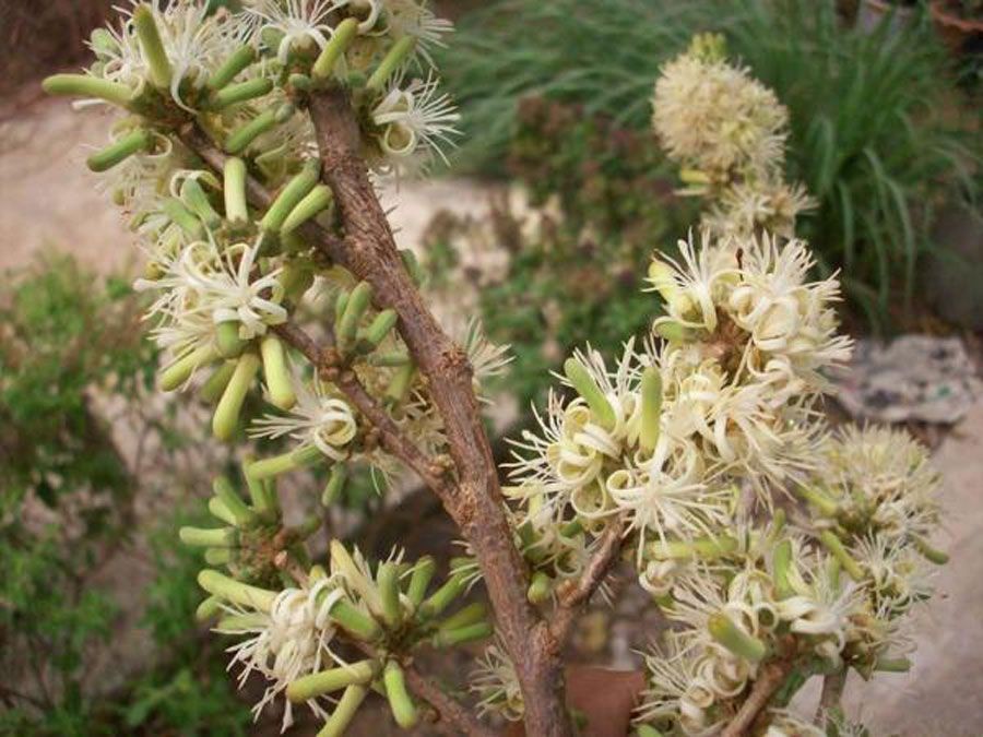 ดอกปรู ออกดอกเป็นช่อรวมกันเป็นกระจุกตามซอกใบหรือตามกิ่งเหนือรอยแผลใบ ยาวประมาณ 2-3 เซนติเมตร ดอกเป็นสีขาวนวลหรือเป็นสีเหลืองอ่อน และมีกลิ่นหอม ดอกมีขนขึ้นอยู่ประปราย กลีบดอกมีประมาณ 5-7 กลีบ ดอกตูมขอบกลีบดอกจะประสานกันเป็นรูปทรงกระบอกยาว ส่วนกลีบรองกลีบดอกเป็นรูปขอบขนานแคบ ๆ ด้านนอกมีขนสีน้ำตาล และแยกแผ่ออกเป็นรูปกังหันในระดับเดียวกันประมาณ 5-6 แฉก มีขนาดประมาณ 0.2-0.5 เซนติเมตร ส่วนโคนจะเชื่อมติดกันลักษณะเป็นท่อรูปกรวย โดยกลีบดอกและกลีบรองกลีบดอกจะมีลักษณะคล้ายกัน แต่กลีบดอกจะม้วนตัวโค้งกลับมาทางโคนก้านดอก ดอกมีเกสรเพศผู้ประมาณ 10-18 ก้าน ส่วนมากมี 12 ก้าน โคนก้านเกสรมีขนยาว ๆ ส่วนเกสรเพศเมียเกลี้ยง มีรังไข่เป็นรูปรี ภายในมีช่องเดียวและมีไข่อ่อนหนึ่งหน่วย และจะออกดอกเต็มต้นหลังการผลัดใบหมด โดยจะออกดอกในช่วงเดือนกุมภาพันธ์ถึงเดือนมีนาคม
