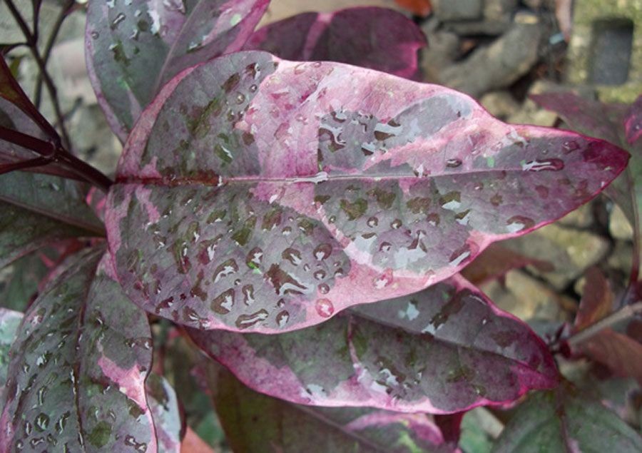 ใบนาก แผ่นใบเป็นสีเขียวแกมน้ำตาลหรือสีเขียวอมม่วง และมีรอยด่างเป็นสีขาวและสีม่วงที่ไม่เป็นระเบียบ ส่วนขอบใบเป็นสีชมพูเข้ม