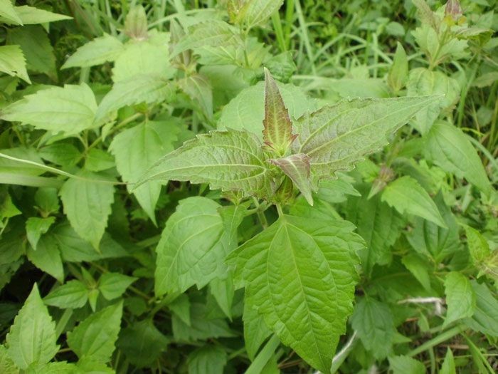 ใบสาบเสือ มีใบเป็นใบเดี่ยวออกจากลำต้นที่ข้อแบบตรงกันข้าม ใบมีสีเขียวอ่อน ลักษณะของใบคล้ายรูปรีทรงรูปสามเหลี่ยม ปลายใบแหลม ฐานใบกว้าง ใบเรียวสอบเข้าหากัน มีขอบใบหยัก ที่ใบเห็นเส้นชัดเจน 3 เส้น ผิวใบทั้งสองด้านมีขนอ่อนปกคลุม ใบและก้านเมื่อนำมาขยี้จะมีกลิ่นแรงคล้ายกลิ่นสาบเสือ