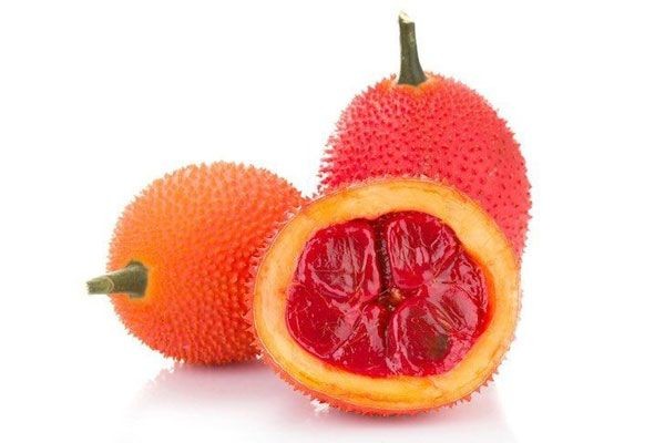 ผลฟักข้าว มีลักษณะคล้ายรูปไข่กลมรี ที่เปลือกมีหนามเล็ก ๆ อยู่รอบผล ผลอ่อนจะมีสีเขียวอมเหลือง แต่เมื่อสุกแล้วผลจะมีสีแดงหรือสีส้มอมแดง ผลสุกเนื้อจะเป็นสีเหลือง มีเยื่อกลางหุ้มเมล็ดเป็นสีแดง