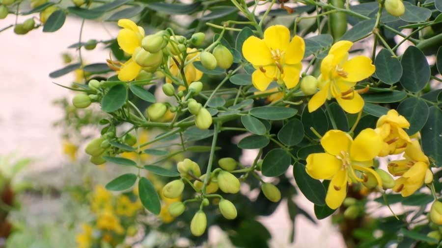 ใบทรงบาดาล ใบเป็นใบประกอบแบบขนนกชั้นเดียว ออกเรียงสลับกัน มีใบย่อยประมาณ 5-10 คู่ ลักษณะของใบเป็นรูปรี ปลายใบมน โคนใบมน ส่วนขอบใบเรียบ ใบมีขนาดกว้างประมาณ 1-2 เซนติเมตรและยาวประมาณ 2.5-4 เซนติเมตร หลังใบเรียบ ส่วนท้องใบมีขนประปราย