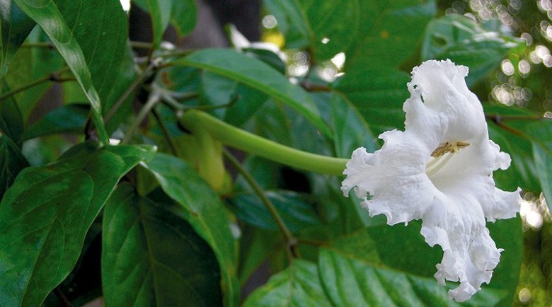 ดอกแคนา ออกดอกเป็นช่อแบบช่อกระจะสั้น ดอกมีขนาดใหญ่ ลักษณะของดอกเป็นรูปแตรสีขาว โดยจะออกดอกตามปลายกิ่ง ดอกยาวประมาณ 2-3 เซนติเมตร ส่วนก้านดอกยาวประมาณ 1.8-4 เซนติเมตร ในแต่ละช่อจะมีดอกอยู่ประมาณ 2-10 ดอก กลีบเลี้ยงหนาและเหนียว ปลายเรียวเล็กและโค้งยาวประมาณ 3-4 เซนติเมตร หุ้มดอกตูมมิด เชื่อมติดกันเป็นหลอดโค้งปลายแหลม เมื่อดอกบานจะมีรอยแตกทางด้านล่าง มีลักษณะเป็นกาบหุ้มกลีบดอกติดกันเป็นท่อ ส่วนปลายขยายออกเป็นรูประฆัง และจะแยกออกเป็นแฉก 5 แฉก กลีบดอกเชื่อมติดกัน ยาวประมาณ 16-18 เซนติเมตร ส่วนหลอดกลีบดอกจะยาวประมาณ 13-14 เซนติเมตร ส่วนโคนจะแคบเป็นหลอด สีเขียวอ่อน ส่วนบนจะบานออกคล้ายกรวยเป็นสีขาวแกมสีขมพู แฉกกลีบดอกมีอยู่ 5 กลีบ ลักษณะเป็นรูปไข่ ยาวประมาณ 3-4 เซนติเมตร ที่ขอบกลีบจะย่นเป็นคลื่น ๆ ดอกเป็นสีขาว ดอกตูมเป็นสีเขียวอ่อน ๆ โคนกลีบมีสีน้ำตาลปน ดอกมีเกสรตัวผู้ 4 อัน ติดอยู่ด้านในของท่อกลีบดอก ปลายแยก มีขนาดสั้น 2 อัน และยาว 2 อัน และยังมีเกสรตัวผู้ที่เป็นหมันอีก 1 อัน มีรูปร่างเป็นเส้นเรียวเล็กคล้ายเส้นด้ายมีความยาวประมาณ 1 เซนติเมตร ส่วนอับเรณูยาวประมาณ 1 เซนติเมตร เป็นสีเทาดำ และจานฐานดอกเป็นรูปเบาะ เป็นพูตื้น ๆ และมีเกสรตัวเมียอยู่ 1 อัน โดยดอกแคนาจะค่อย ๆ บานทีละดอก ดอกมีกลิ่นหอม ดอกบานในตอนกลางคืน และจะออกดอกในช่วงเดือนมีนาคมถึงเดือนมิถุนายน