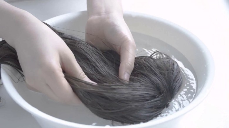 3. ใส่วิกผมลงไป เคล็ดลับสำคัญอยู่ที่การแช่ จะต้องไม่เอาปลายผมลงไปก่อนแต่ต้องเอาส่วนที่เป็นหนังศีรษะลง แล้วค่อยๆ จุ่มส่วนอื่นตามลงไป เส้นผมจะได้ไม่พันกัน